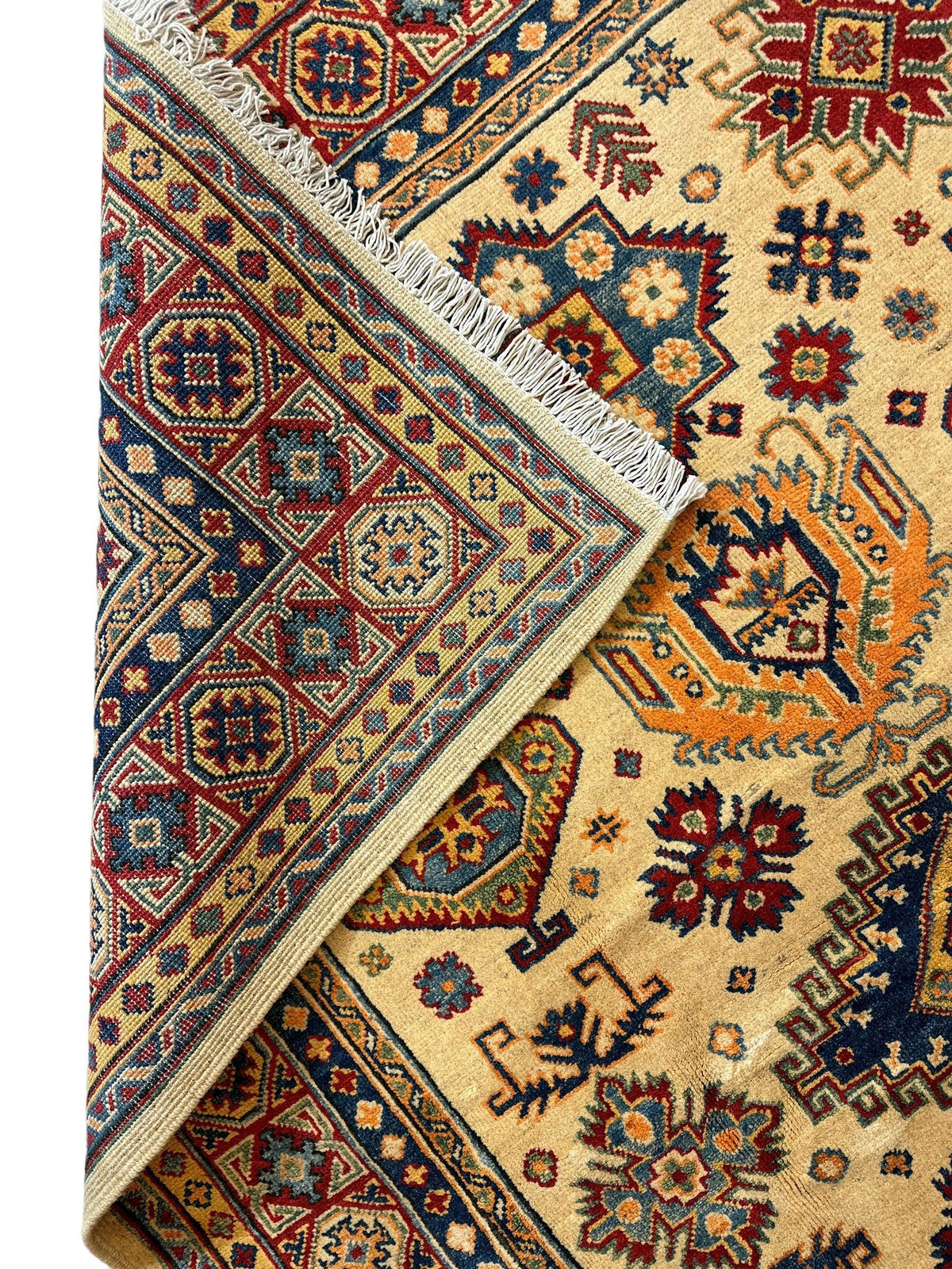 Afgan zanaatkarlar tarafından dokunan bu Kazak halısı, büyük ölçüde Kafkaslardaki kabilelerden esinlenerek yapılmış, oldukça geometrik ve karmaşık desenlere sahiptir.