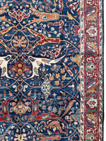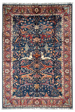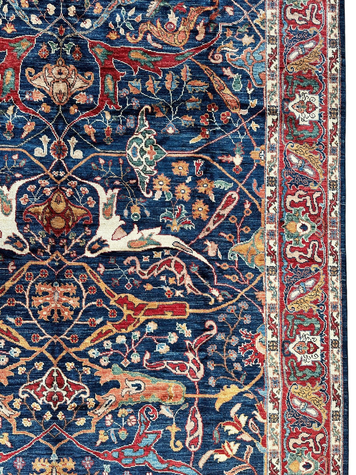 Bu göz alıcı el dokuması Afgan Bidjar halısı, göz alıcı kırmızı bordürlü koyu lacivert bir zemine, karmaşık çiçek motifleri ve simetrik madalyonlarla süslenmiştir. Yüksek kaliteli Gazne yünü kullanılarak dokunan halı, yumuşak ancak dayanıklı bir doku sunar. Geleneksel Bidjar dokuma tekniğinden ilham alan bu halı, yoğun düğümleri ve uzun ömürlü dayanıklılığıyla bilinir. Gösterişli bir alan halısı olarak ideal olan bu halı, hem klasik hem de çağdaş iç mekanları tamamlar.