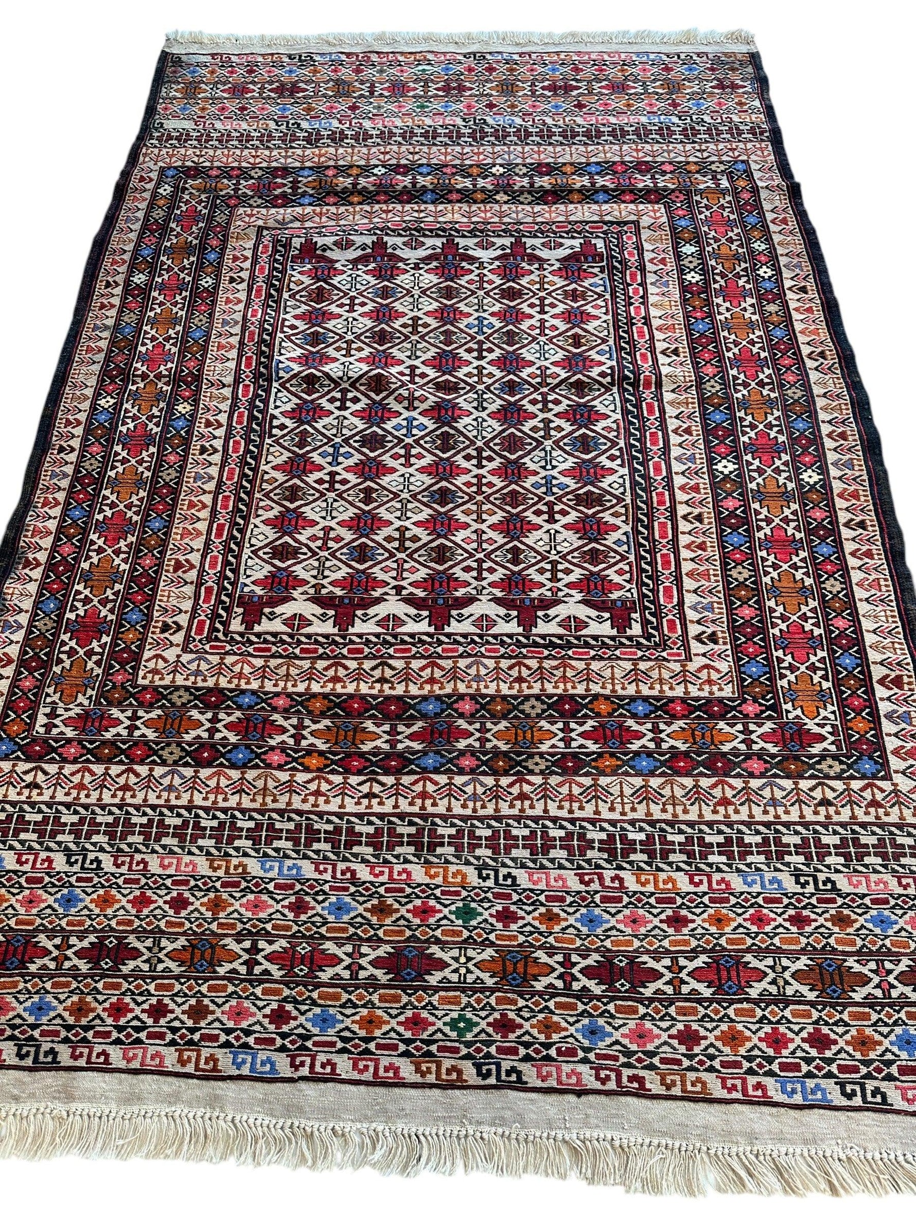 Oturma odaları, yemek alanları veya diğer orta büyüklükteki alanlar için mükemmel olan bu kilim halı, hem hafif hem de çok yönlüdür. %100 yünden üretilen bu halı, evinize sıcaklık ve zarafet katarken aynı zamanda çevre dostudur. Her bir parça, nesiller boyunca Afgan dokuma geleneklerini mükemmelleştiren yetenekli zanaatkarların bir kanıtıdır.