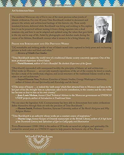 The Moroccan city of Fez, founded in the ninth century CE, is one of the most precious urban jewels of Islamic civilization. For more than 40 years Titus Burckhardt worked to document and preserve the artistic and architectural heritage of Fez in particular and Morocco in general. These newly translated lectures, delivered while Burckhardt was living and working in Fez, explore how the historic city can be preserved without turning it from a living organism into a dead museum-city, and how it can be adapted and updated using the values that gave birth to the city and its way of life. Aided by photographs and sketches made during the course of his lifetime, Burckhardt conveys what it means to be a living Islamic city.