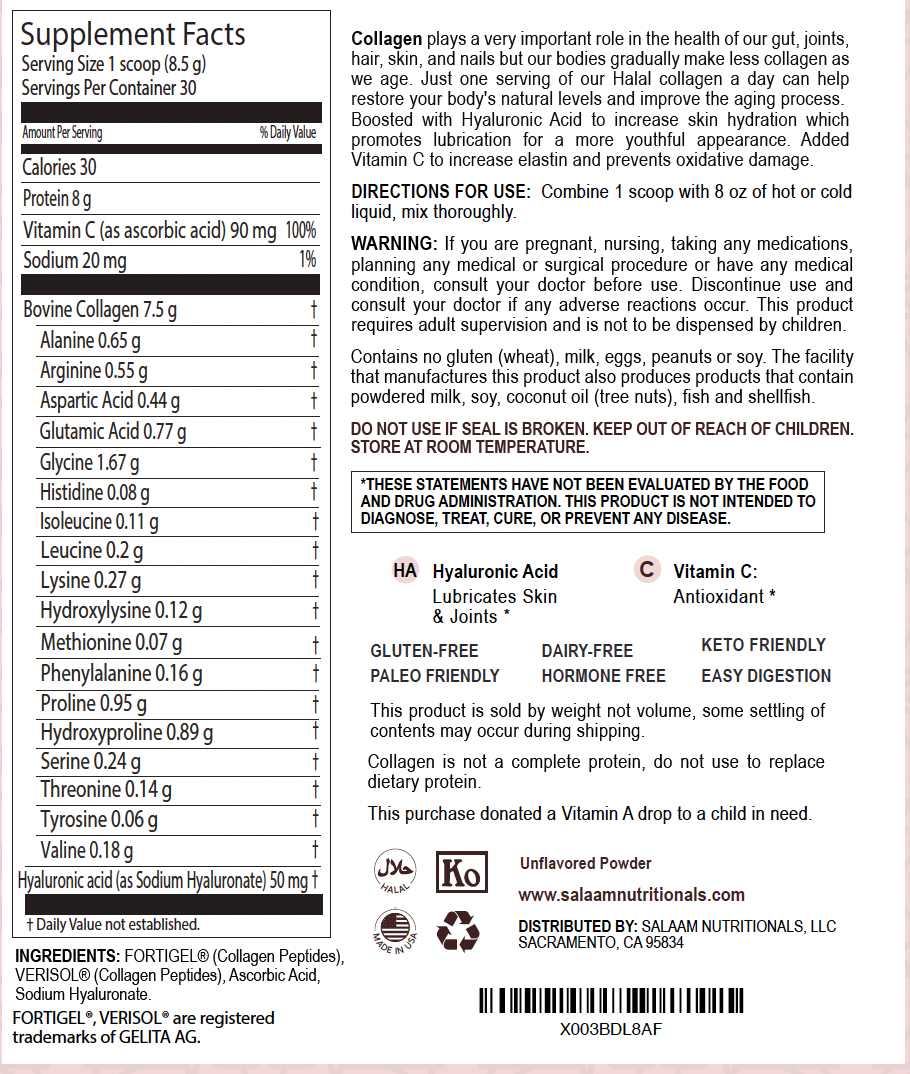 Saf Helal Kolajen Hidrolize Peptit Tip 1 ve 3 Tozu - C Vitamini ve Hyaluronik Asit ile | Salaam Nutritionals