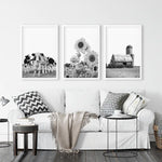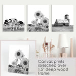 Rustik Siyah Beyaz Duvar Sanatı Seti. İnekler, Ayçiçekleri, Eski Ahır