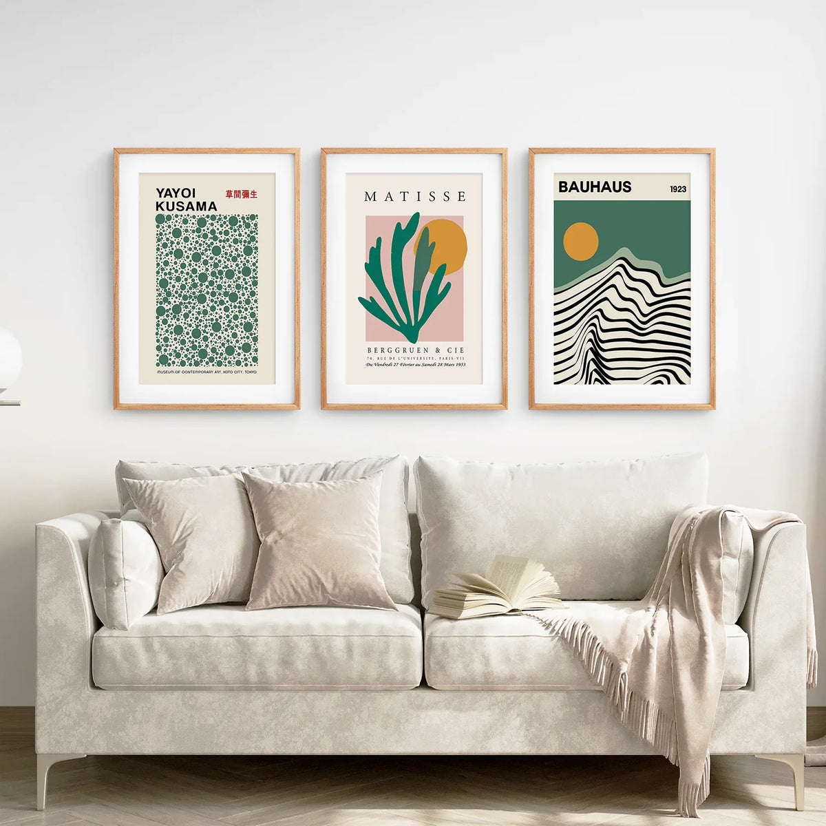 Üç sergi baskısından oluşan bu paket, Bauhaus posteri, Yayoi Kusama baskıları ve göz alıcı adaçayı yeşili Henri Matisse eseri gibi klasik sanat eserlerini içeriyor. Bu büyük duvar sanatı baskıları, çerçeveli triptik veya kanvas triptik olarak mevcut olup, her modern eve şıklık katacak göz alıcı bir eserdir.