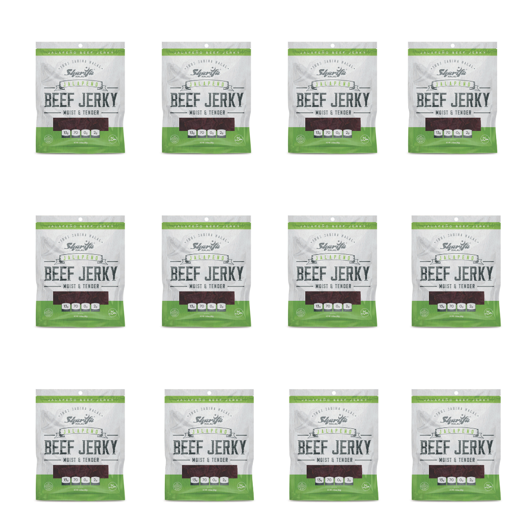 Sharifa Helal Jalapeno Sığır Eti Jerky, birinci sınıf %100 Zabiha Helal Sığır Eti ile yapılır. Birçok kişi diğer sığır eti jerky'lerinin çok sert ve çok kuru olduğundan şikayet ederken, biz ve Sharifa Helal her zaman nemli ve yumuşak bir helal sarsılmış et ürünü ürettik. Sharifa Karabiberli Sığır Eti Jerky, cips ve sostan çok daha sağlıklı, harika bir et atıştırmalığıdır. Lezzetli ürünümüz, porsiyon başına 13 gr Protein, sadece 70 kalori, 0 gr Trans Yağ ve sadece 2 gr Karbonhidrat içerir. Ayrıca, tazeliğini koruyabilmeniz ve ilk açtığınız zamanki gibi tadını alabilmeniz için tekrar kapatılabilir bir torba ekledik. Birinci sınıf helal sığır etimiz USDA tarafından denetlenmiş ve net ağırlığı 2,85 oz'dur. Sığır eti jerky'nin en güzel yanı, çok uzun raf ömrüne sahip olmasıdır.
