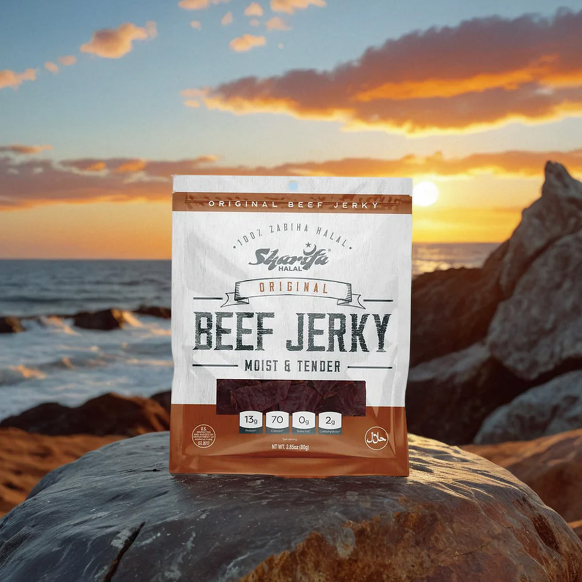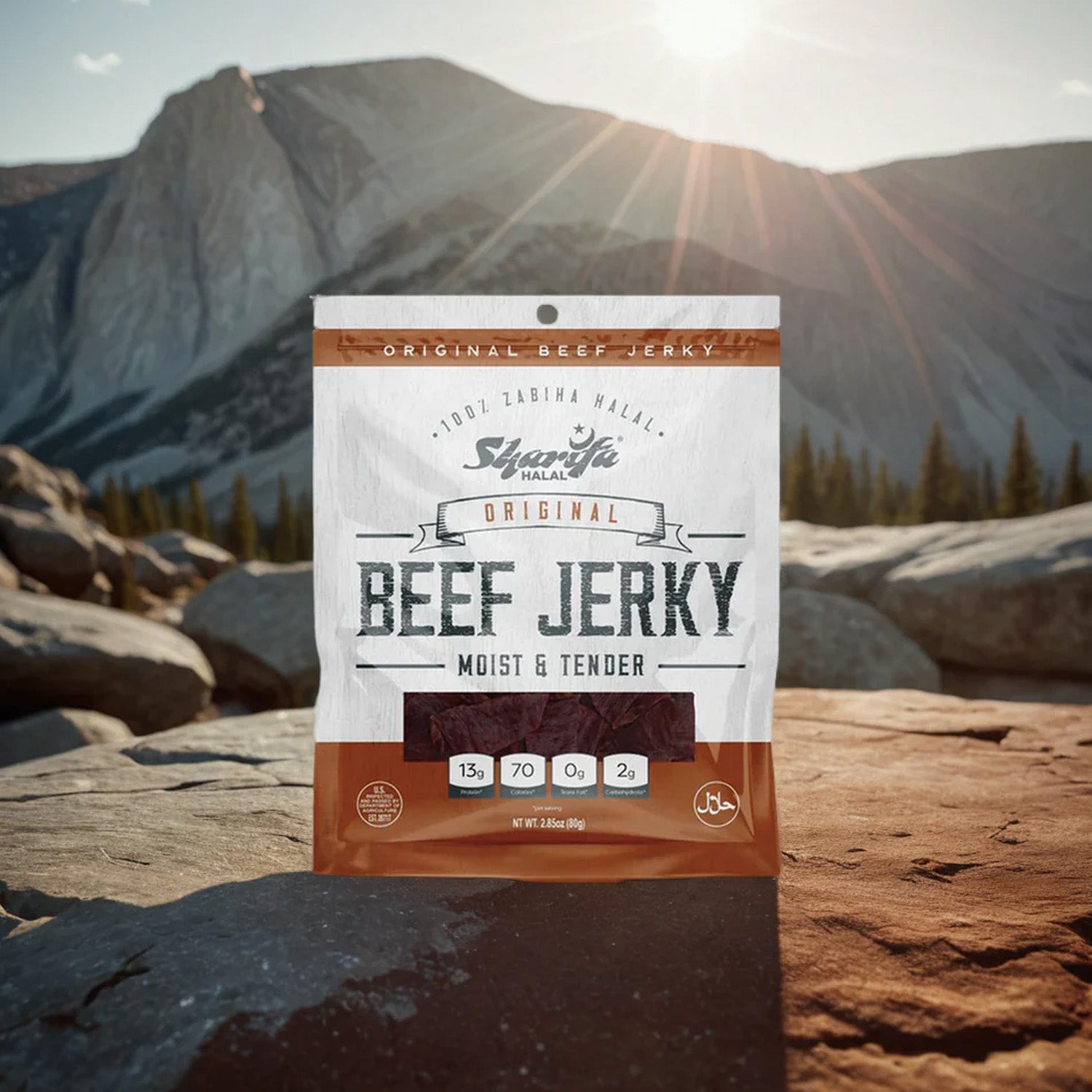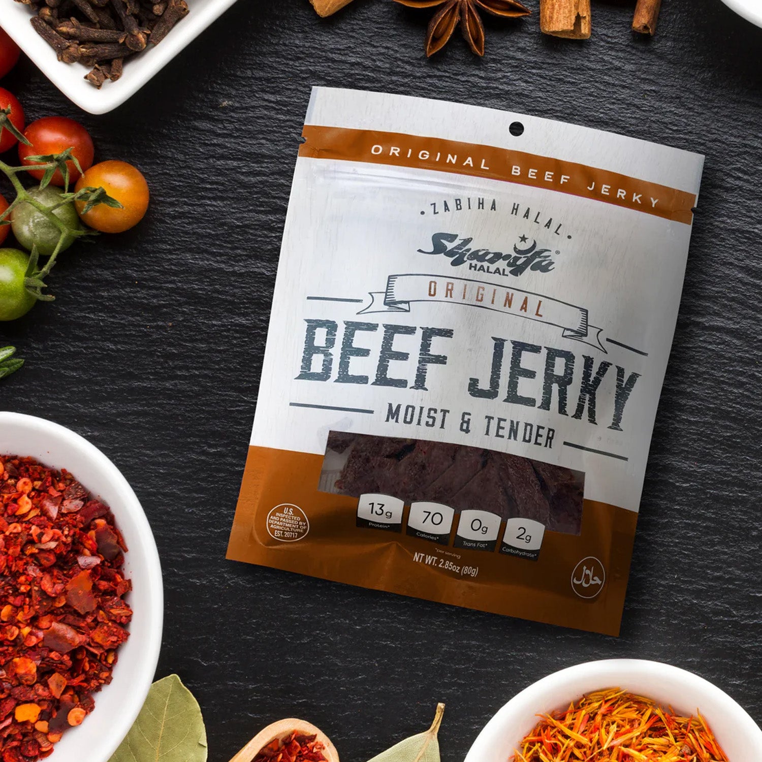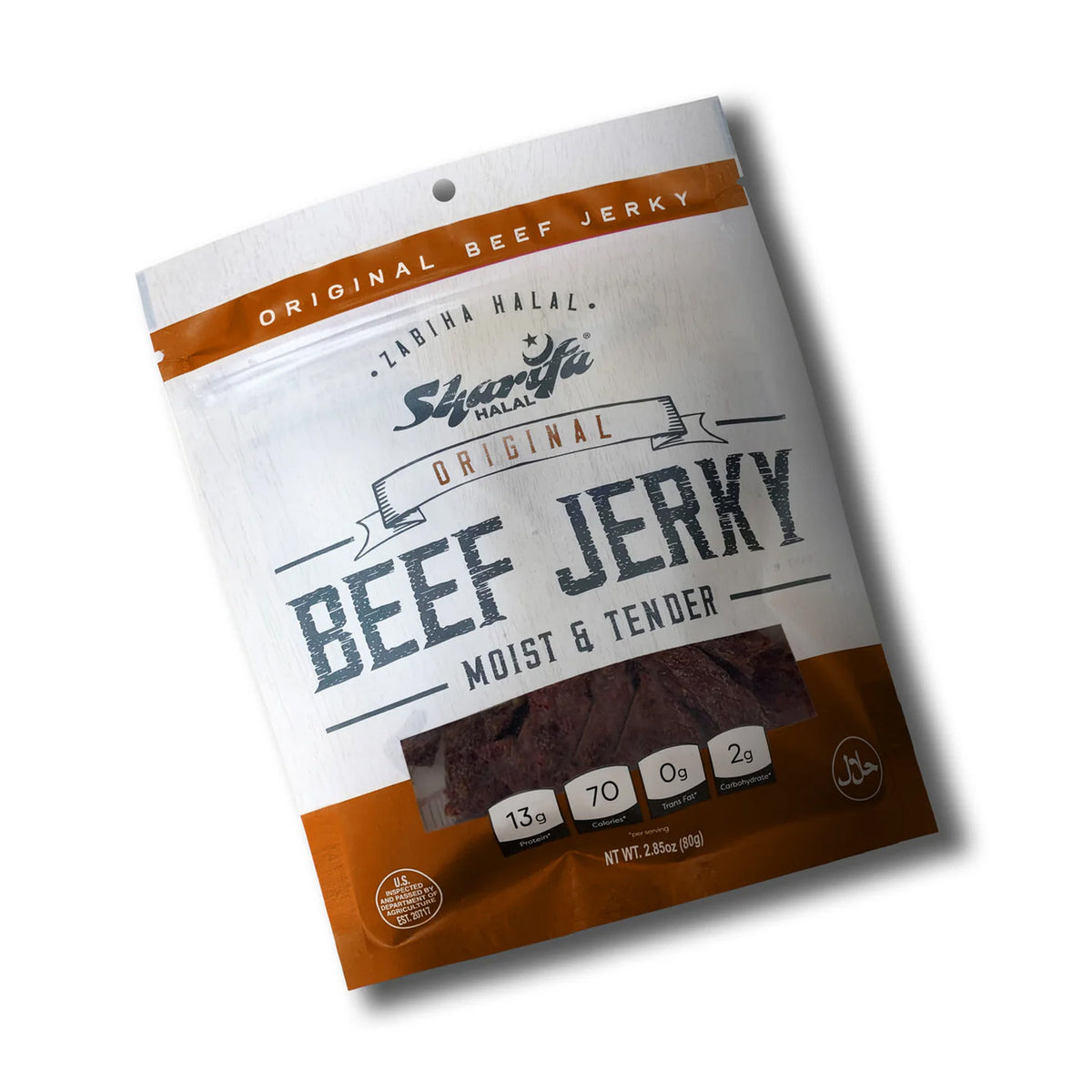 Sharifa Halal Original Beef Jerky, birinci sınıf %100 Zabiha Helal Sığır Eti ile yapılır. Birçok kişi diğer sığır eti kurularının çok sert ve çok kuru olduğundan şikayet ederken, biz ve Sharifa Halal her zaman nemli ve yumuşak bir helal kuru et ürünü ürettik. Sharifa Original Beef Jerky, cips ve sostan çok daha sağlıklı, harika bir et atıştırmalığıdır. Lezzetli ürünümüz, porsiyon başına 13 gr yüksek Protein, sadece 70 kalori, 0 gr Trans Yağ ve sadece 2 gr Karbonhidrat içerir. Ayrıca, tazeliğini koruyabilmeniz ve ilk açtığınız zamanki gibi tadını alabilmeniz için tekrar kapatılabilir bir torba ekledik. Birinci sınıf helal sığır etimiz USDA tarafından denetlenmiş ve net ağırlığı 2,85 oz'dur. Sığır eti kurusunun en güzel yanı, çok uzun raf ömrüne sahip olmasıdır.