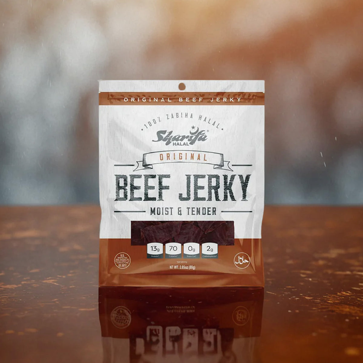 Sharifa Helal Sığır Eti Jerky, Orijinal, (1) 2,85 oz. Poşet - Harika Her Gün Helal Jerky Sığır Eti Atıştırmalığı, %100 Gerçek Zabiha Helal Sığır Eti, 13 g Protein, 70 Kalori, 0 g Trans Yağ ve 2 g Karbonhidrat Marka: SHARIFA HALAL