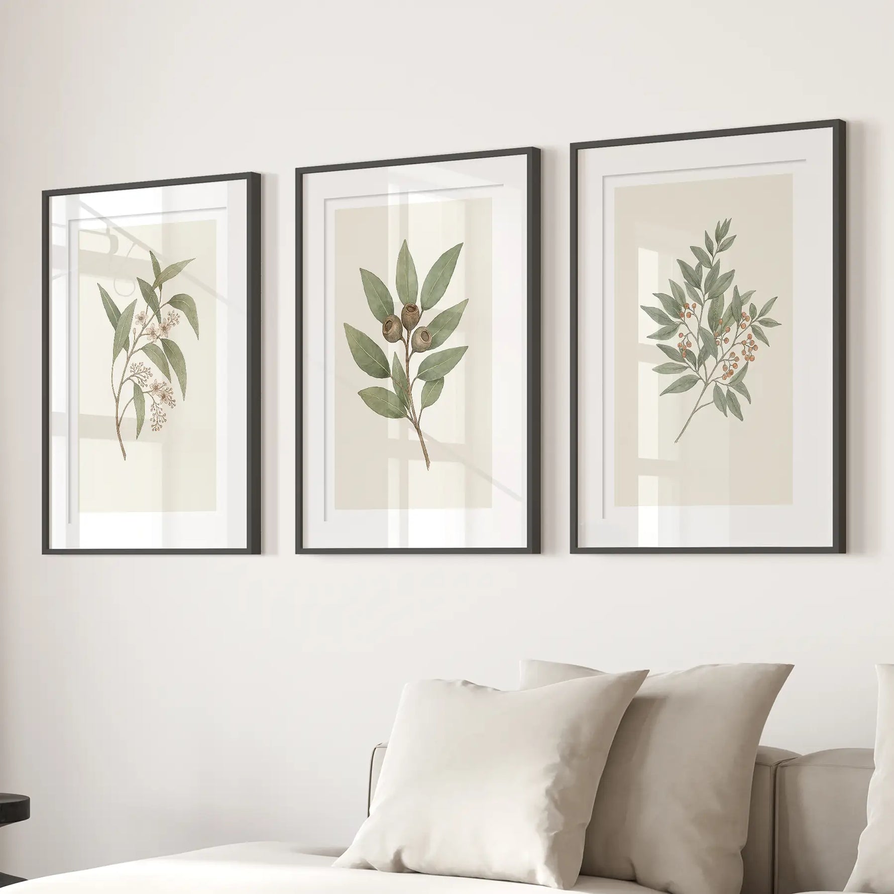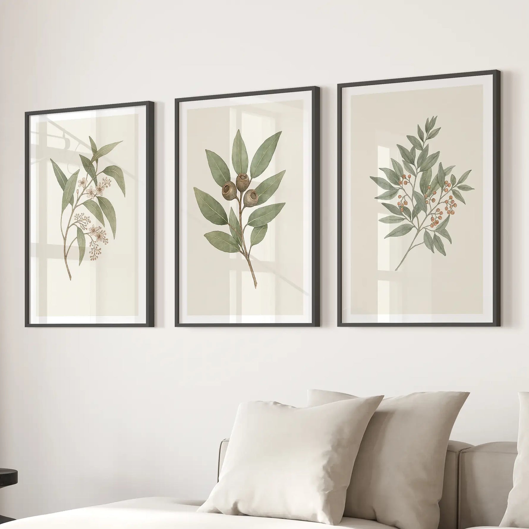 Zarif yeşil yapraklar, tohum kabukları ve meyve dallarından oluşan 3'lü botanik duvar sanatı seti. Yumuşak bej arka planlı minimalist suluboya tasarımı, sakinleştirici ve zamansız bir stil yaratır. Doğal güzelliği ve dingin dekoru kucaklayan oturma odaları, yatak odaları veya modern iç mekanlar için mükemmeldir.